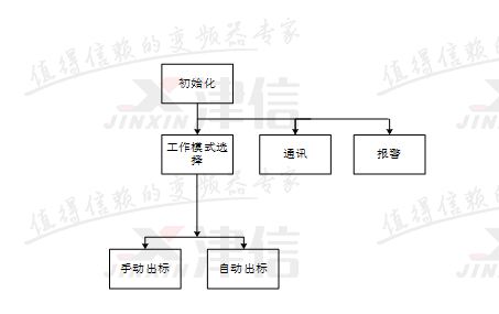 開機后,首先進行程序的初始化。初始化完成后同時調用工作模式選擇、報警和PLC與變頻器之間的通訊程序。工作模式中,包含手動出標、自動出標兩種狀態。報警程序用于對機器狀態進行實時監控,并根據故障情況執行相關動作。